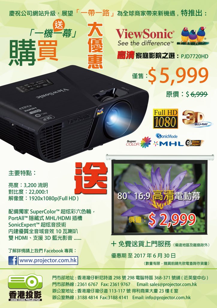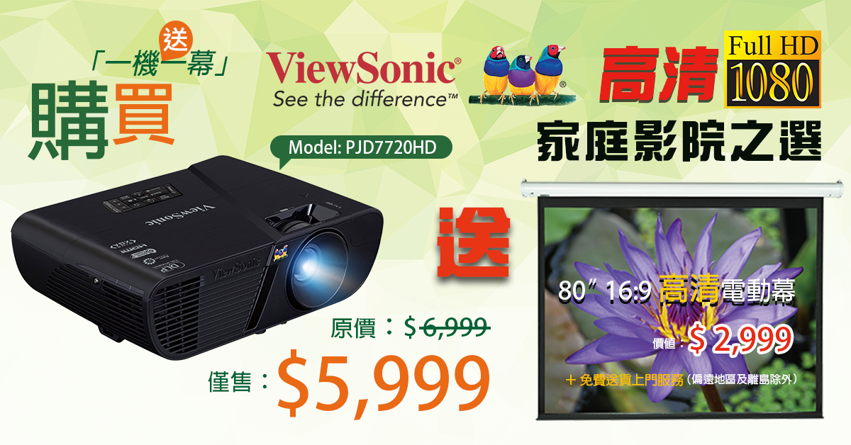 ViewSonic PJD7720HD可以較低價格卻能為你呈現高解析度的畫質享受,實爲一款性價比極高的組合家庭影院用投影機。而配合活動贈送的價值$2,999的電動投影幕,幕料採用高等級白塑物料、精准定位的新型同步電機, 是保證高清靚畫質播放的優良幕布。