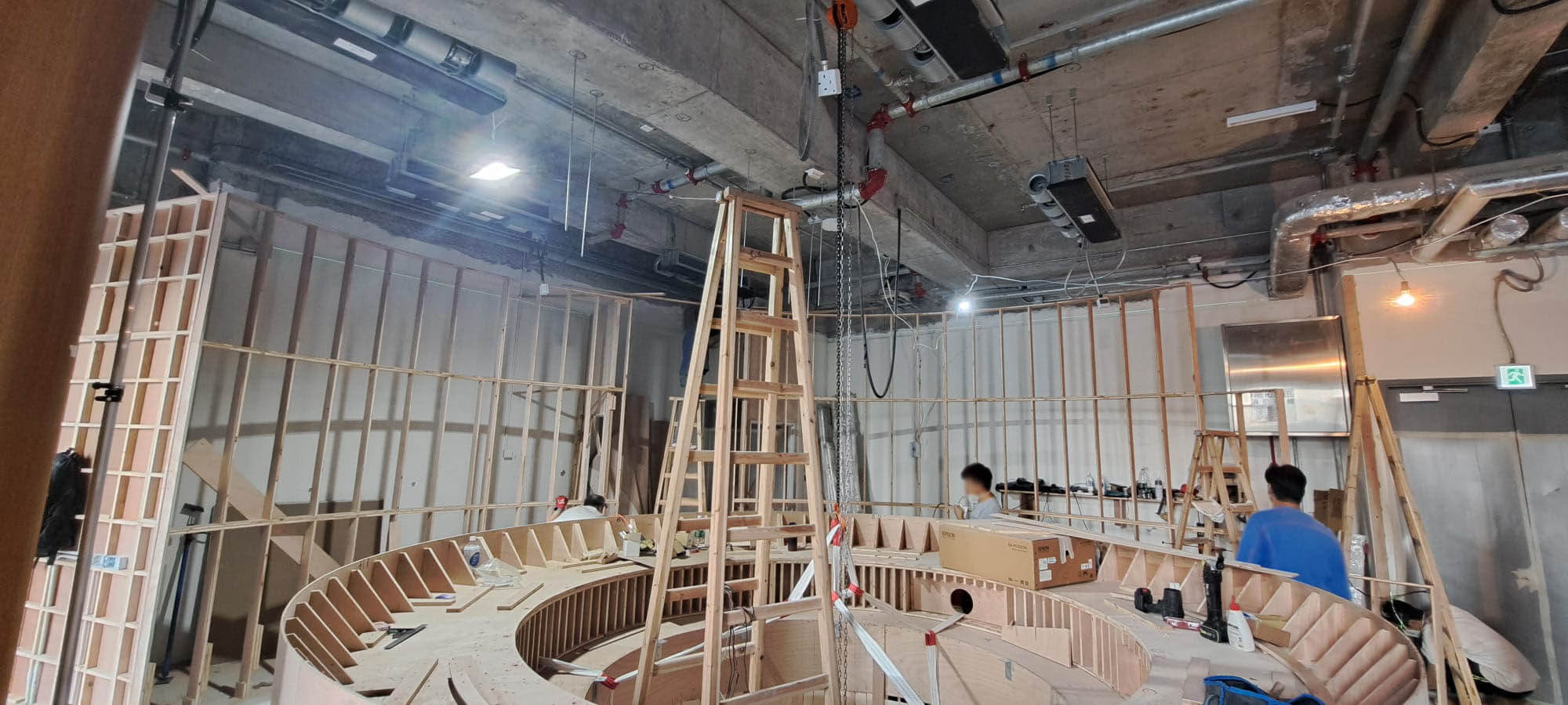 五部投影機的弧形融合調校,是整個項目最具挑戰性的環節。香港投影的專業技術團隊與設計師反覆溝通、多次實地測量,在狹窄的天花裝置空間中反覆調整每部投影機的角度、位置和焦距。