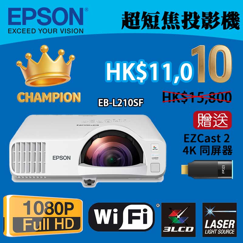 Specification: 【十年冠軍 感恩同行】EPSON EB-L210SF 商務教育雷射短焦投影機 跟機贈送EZCast2無線投屏器乙只