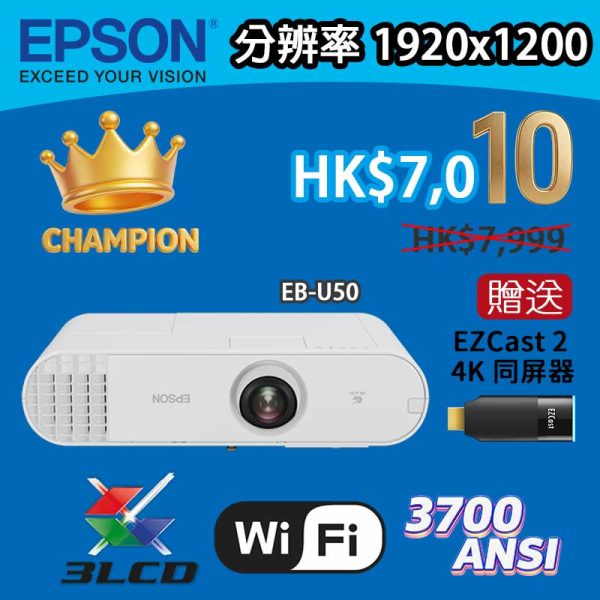 【十年冠軍 感恩同行】EPSON EB-U50 內置WIFI 【特殊防塵】 跟機贈送EZCast2無線投屏器乙只
