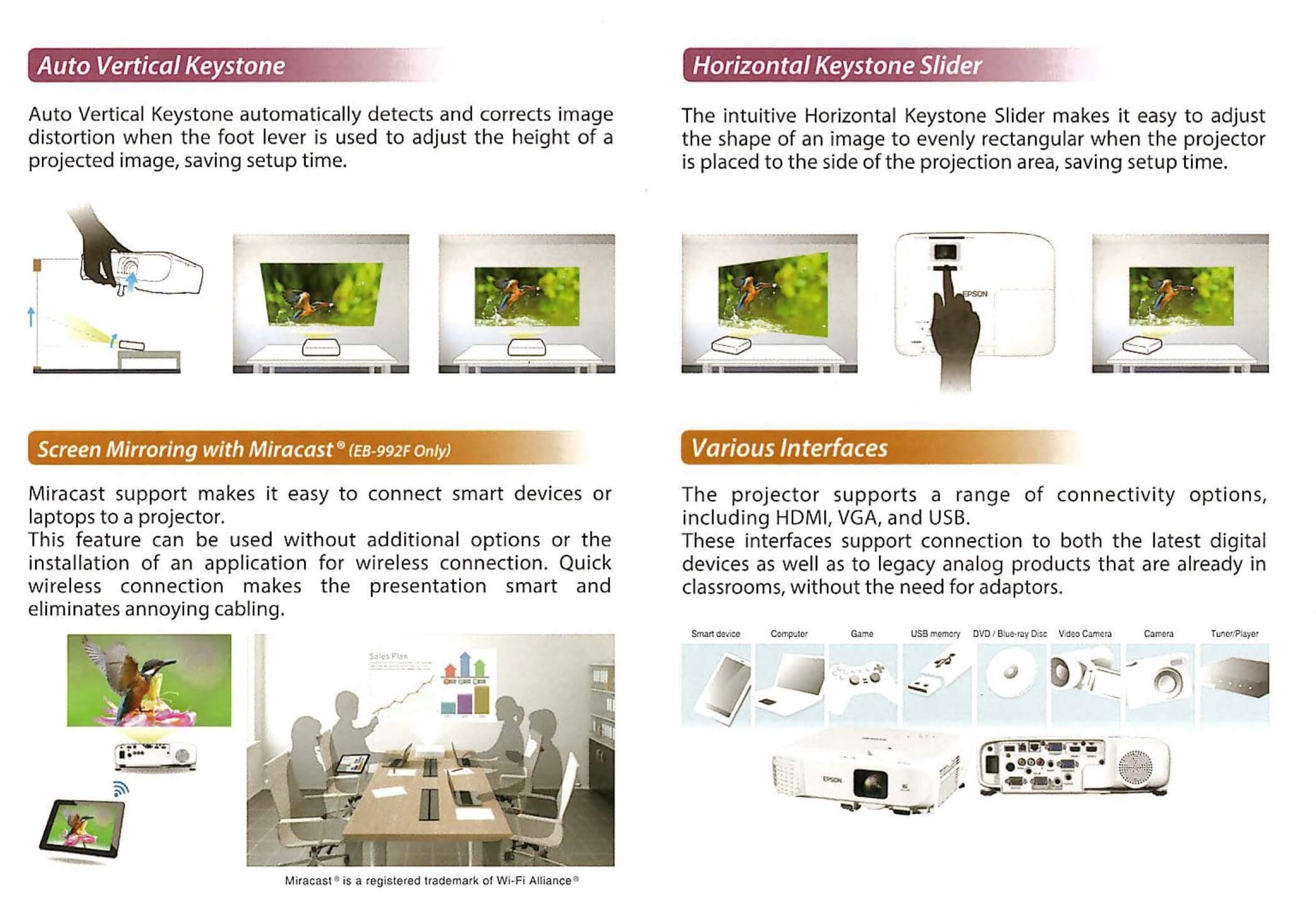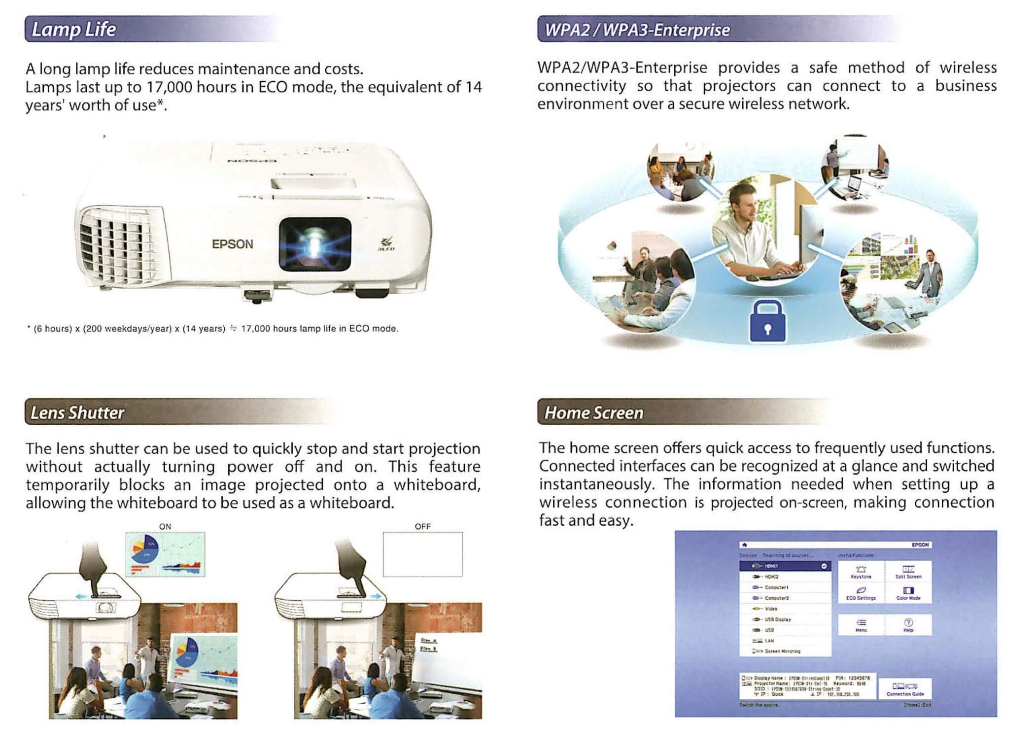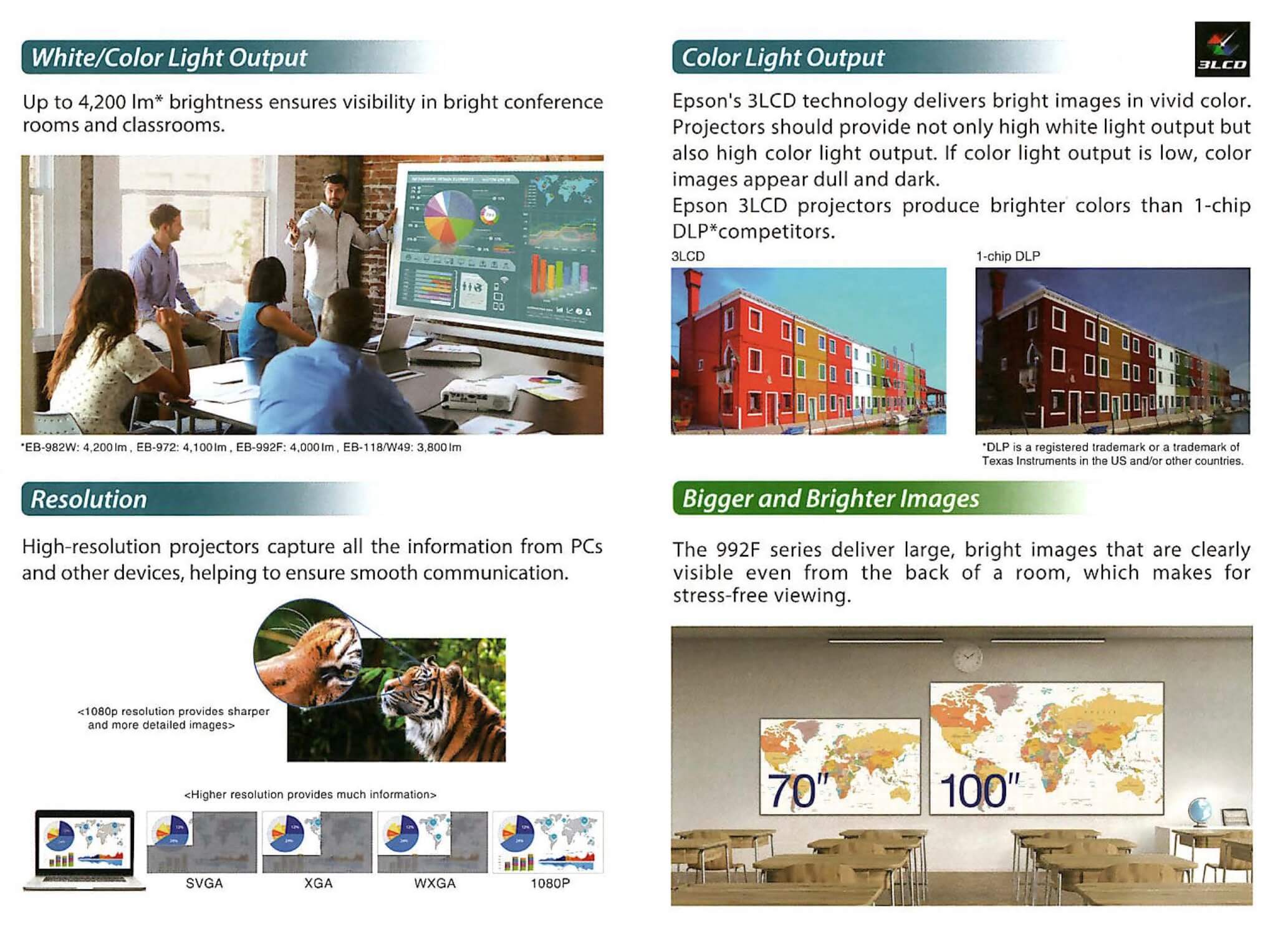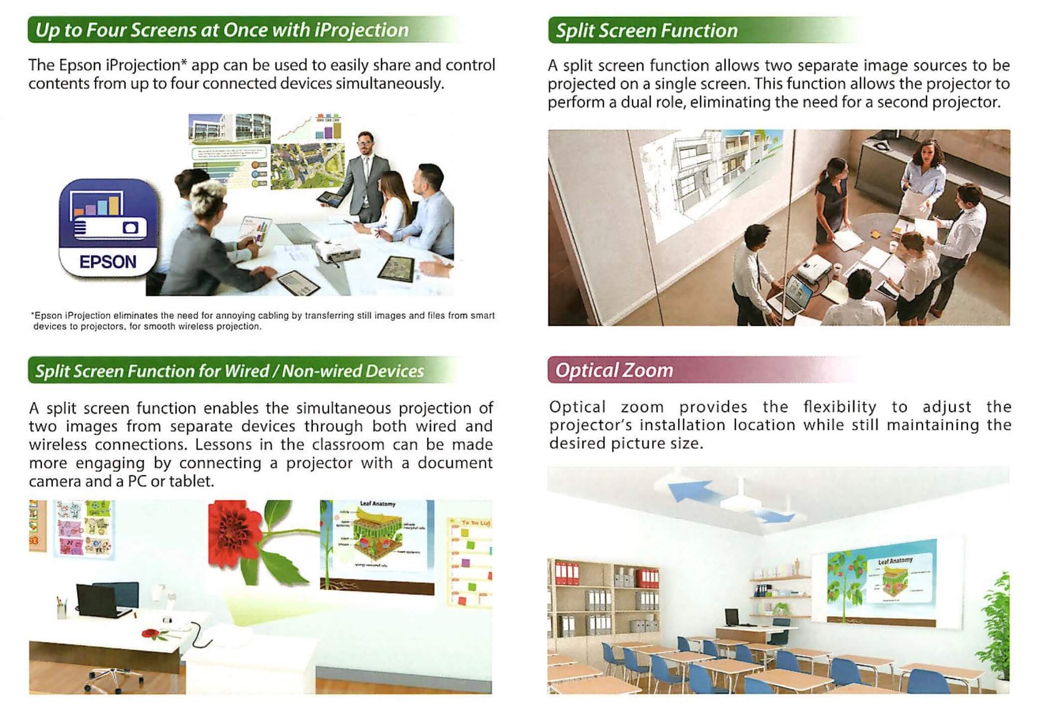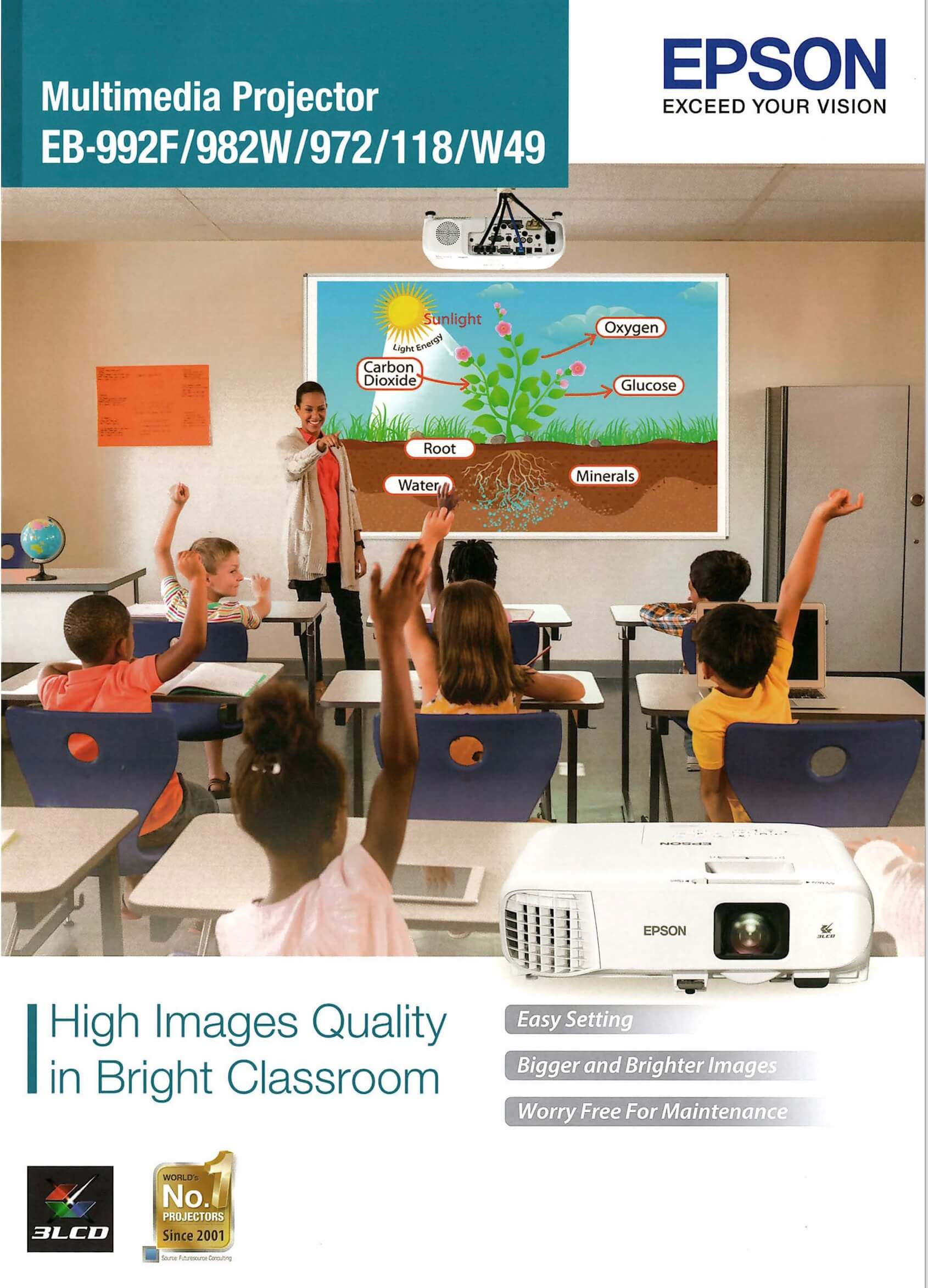 Epson 提供課室最優質實惠的投影方案。Epson 3LCD投影機的色彩亮度比主要競爭對手高達3倍*,畫面清晰自然之餘,亦讓學生更投入到課堂之中。EB-W49具備WXGA解像度和3800流明白色及色彩亮度。其低成本,壽命持久的燈膽在ECO Mode2中可使用長達17,000小時。另外,EB-W49附有管理軟件3和網絡功能可同時無線連接多部設備(包括電腦,iOS®和Android™設備)。EB-W49還具有兩組HDMI®連接。
