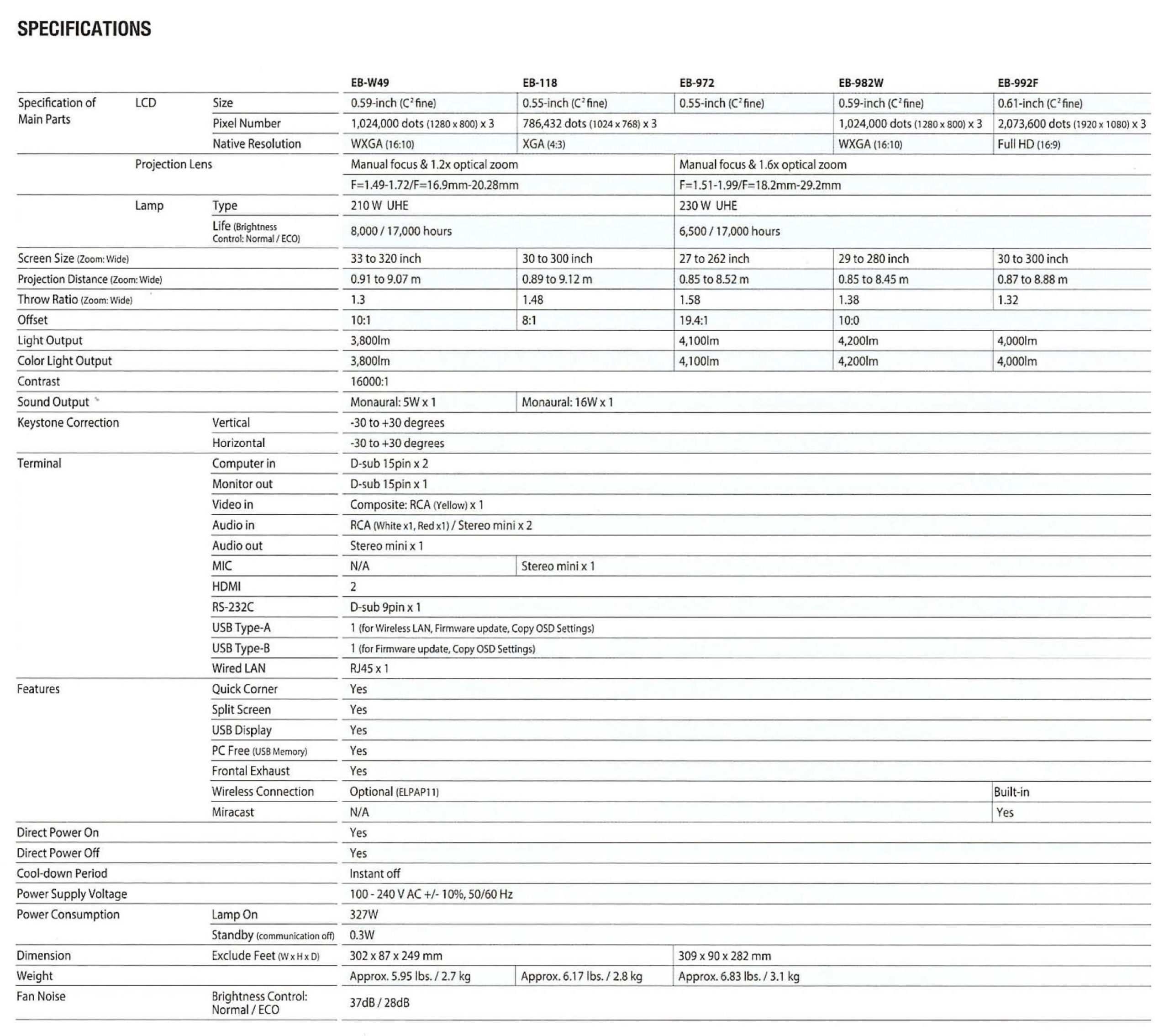 Specification: Epson EB-W49 WXGA 3LCD 高流明教育投影機