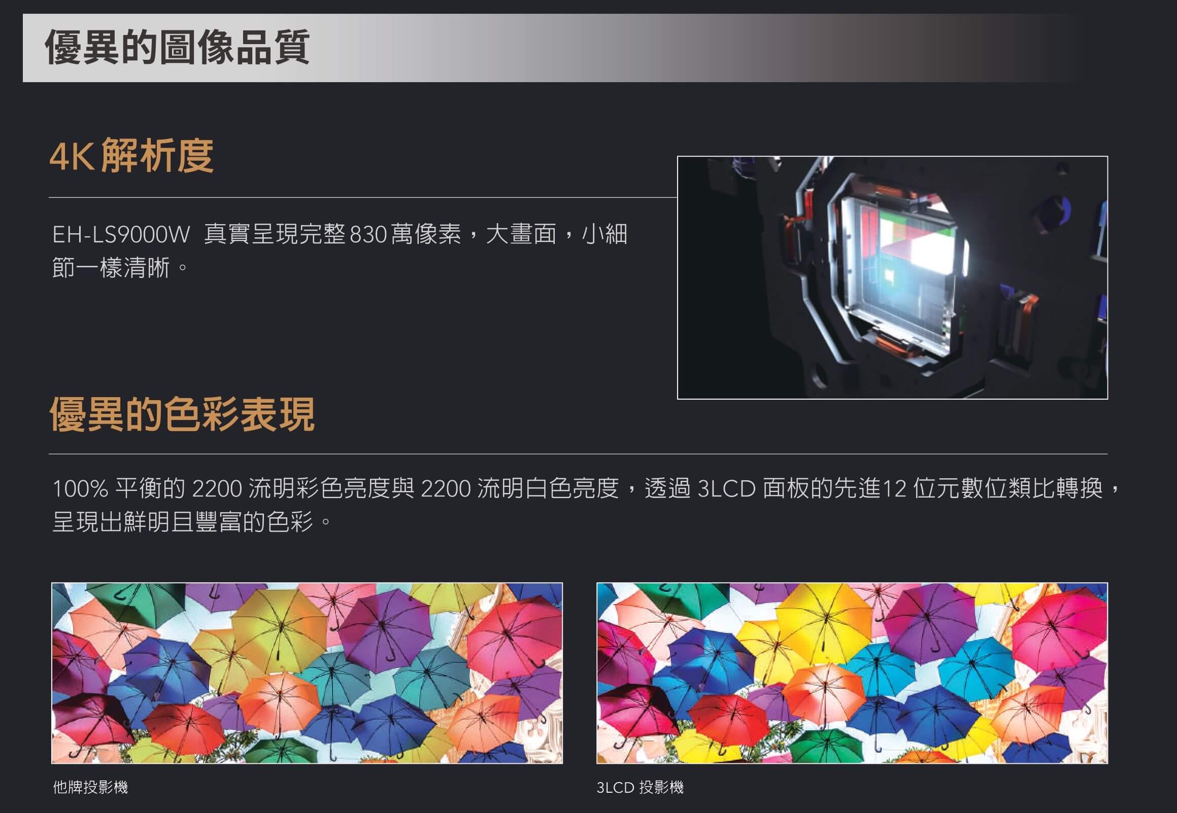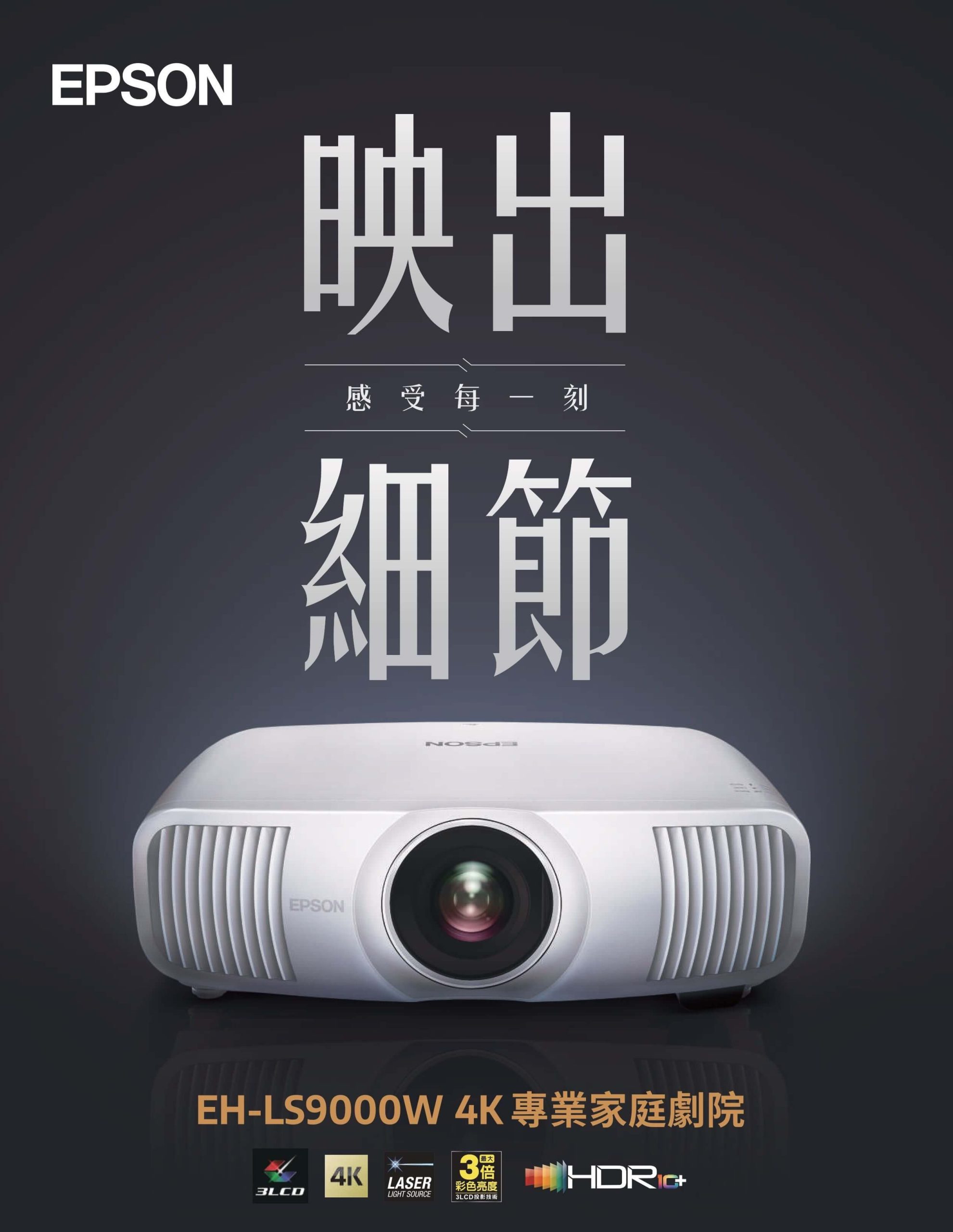 Epson 旗艦4K 家庭影院 3LCD雷射投影機 EH-LS9000W, 配備極致4K 解像度、3LCD技術結合雷射光源、並支援HDR10+, 令影像更接近真實色彩,讓你在家中就能體驗精彩的視覺盛宴,享受大螢幕的震撼影像,讓家庭影院升級為高級電影院。