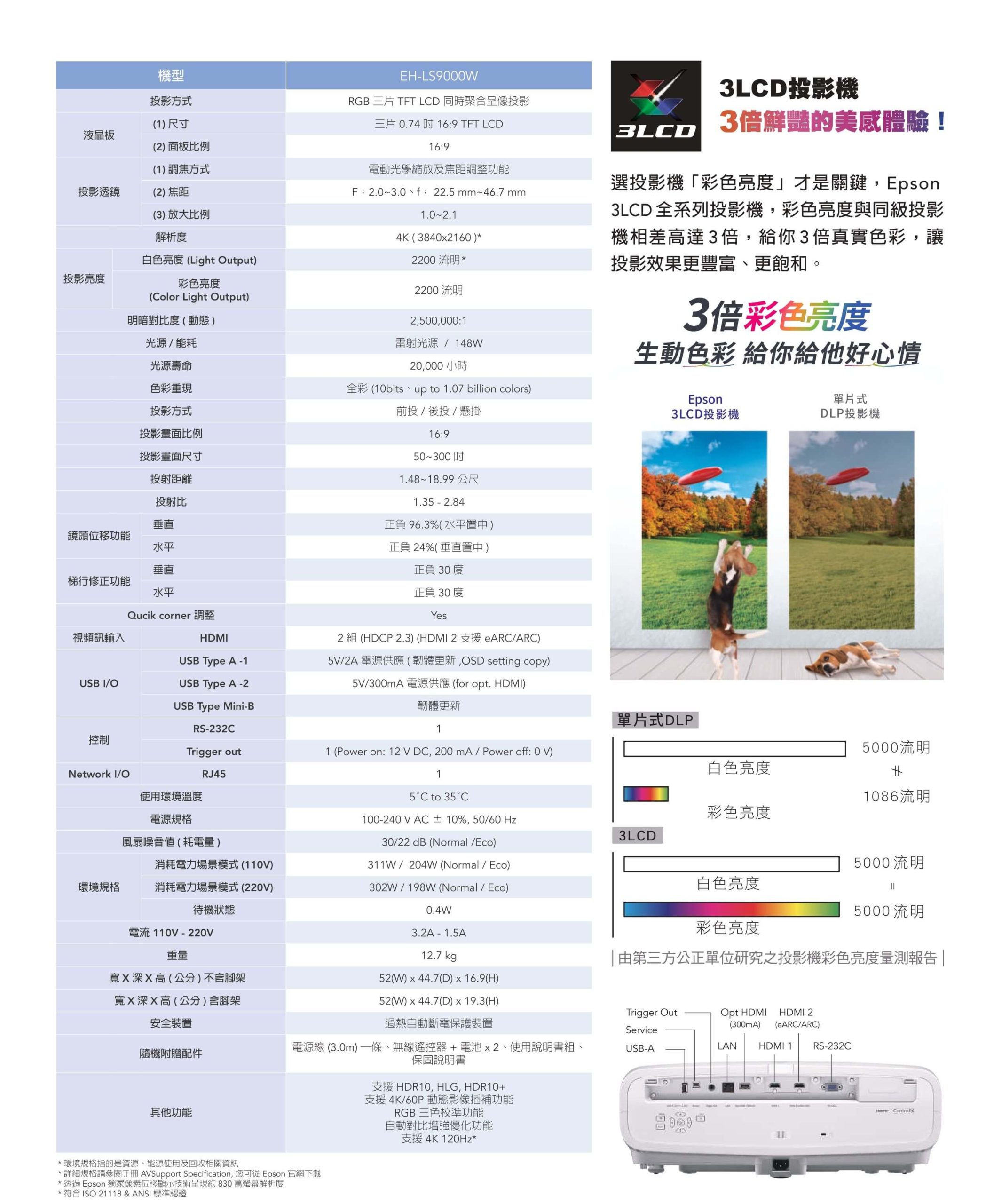 Specification: EPSON EH-LS9000W 旗艦級 4K Enhancement家庭影院 3LCD雷射投影機(需要預訂)