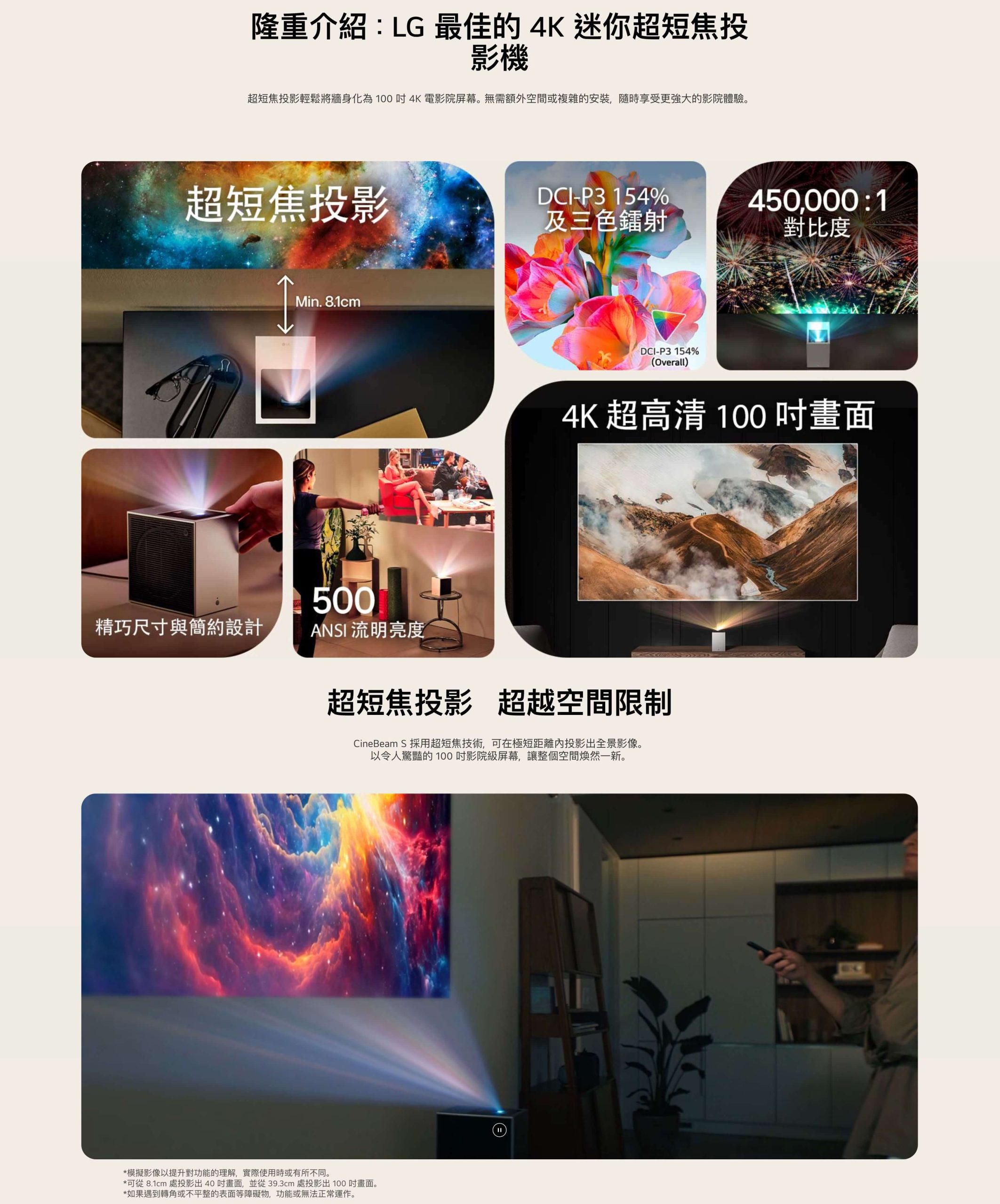 LG CineBeam S 4K 迷你超短焦投影機,支援 Dolby Atmos