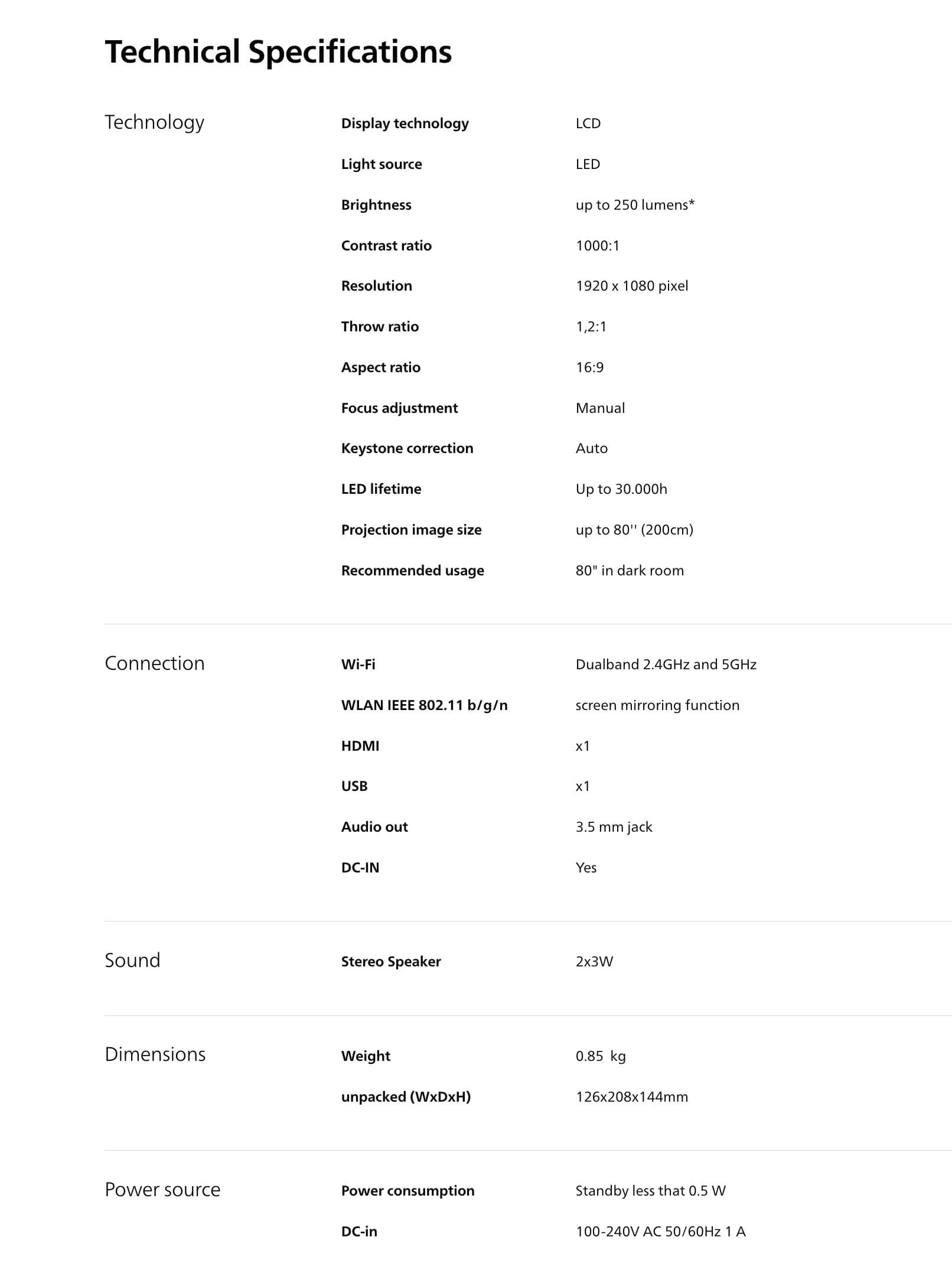 Specification: PHILIPS 飛利浦NeoPix 150 投影機 NPX150/INT